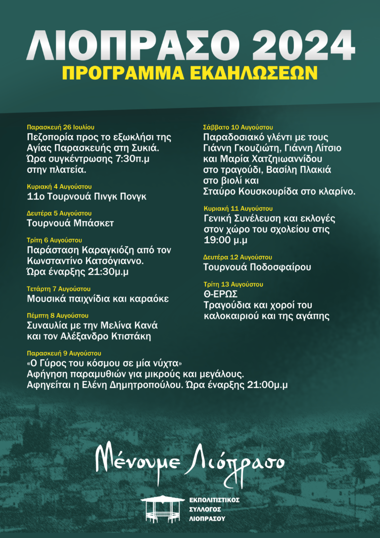 Το πρόγραμμα των εκδηλώσεων για το καλοκαίρι του 2024. Περισσότερες πληροφορίες μπορείτε να δείτε εδώ.
